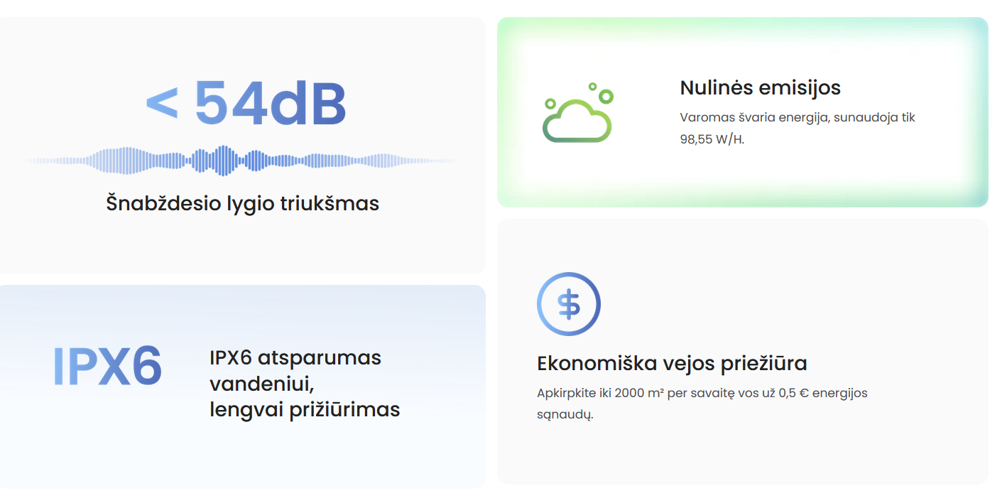 Pjovimo plotas per valandą: 80–120 m² (priklausomai nuo vejos sudėtingumo)