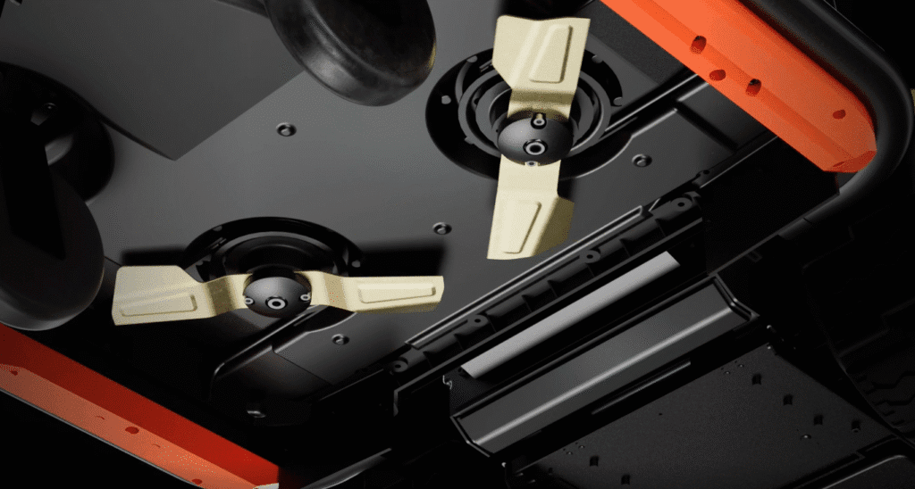 Yarbo vejos pjovimo robotas turi pažangią priekyje montuojamą pjovimo platformą, sustiprintą spyruoklių sistema, kuri sumaniai paskirsto svorį link pagrindo. Šis novatoriškas dizainas ženkliai sumažina ratų poveikį vejos paviršiui, todėl veja atrodo vienodai tanki ir primenanti kilimą. Pjovimo modulis sukurtas taip, kad prisitaikytų prie reljefo, galėdamas judėti tiek skersai, tiek išilgai, užtikrinant tikslų manevravimą. Rezultatas? Speciali atraminė konstrukcija, leidžianti pjauti arčiau žemės ir tolygiau – suteikiant vejos paviršiui nepriekaištingą išvaizdą kiekvienu pravažiavimu, ypač šlaituose, robotas meistriškai prisitaiko prie nuolydžių ir nelygumų, užtikrindamas išskirtinę pjovimo kokybę.